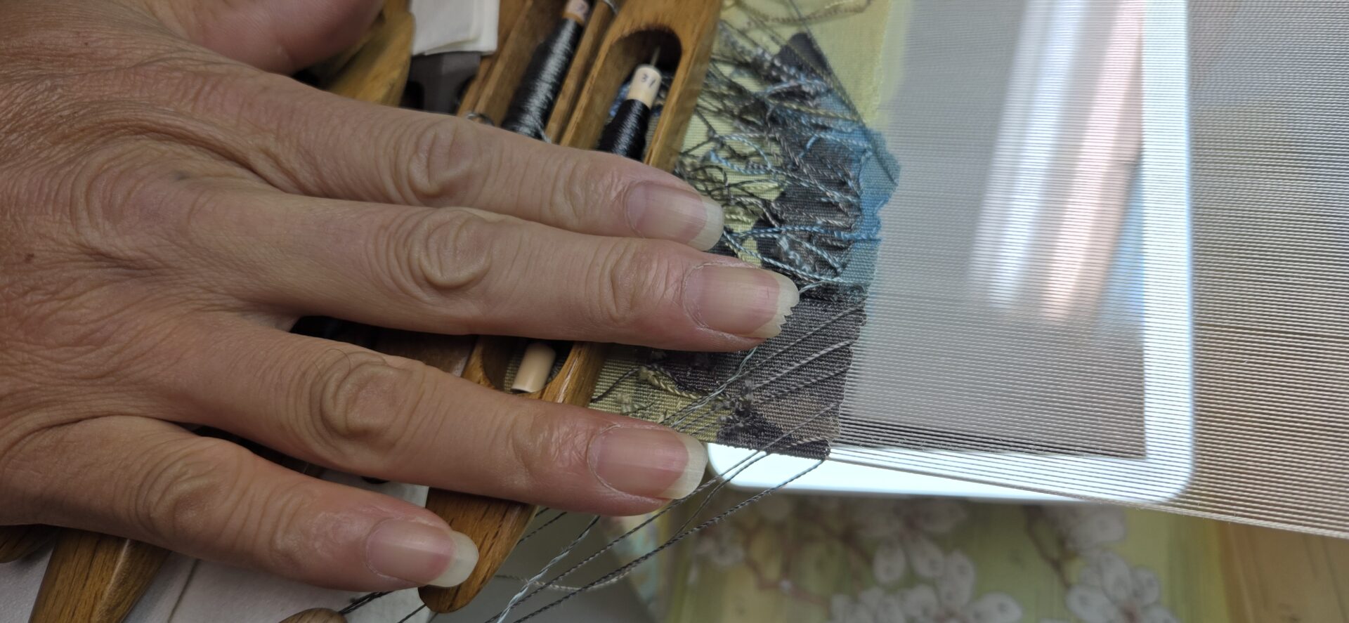 織機の前では、職人さんが小さな杼(シャトル)を何本も使い分けながら模様を織り出していきます。