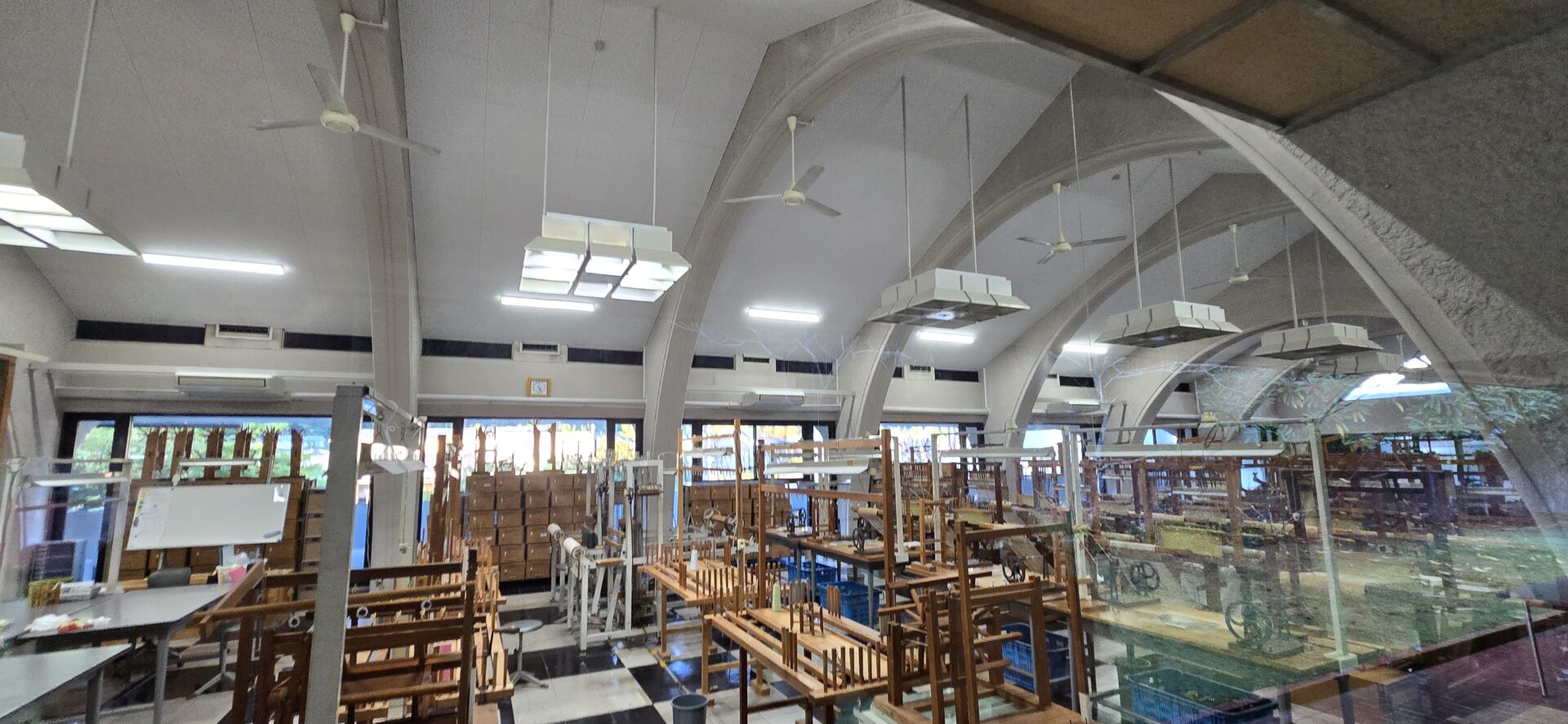 同じ織機が整然と並ぶ教室は、まさに「技術の道場」のようです。