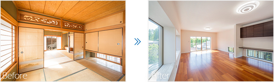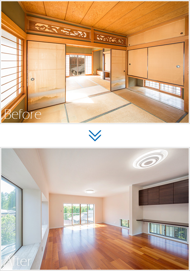 贅沢な欄間のある2間続いた和室を洋室1部屋に改修。広く使えるリビングの完成。